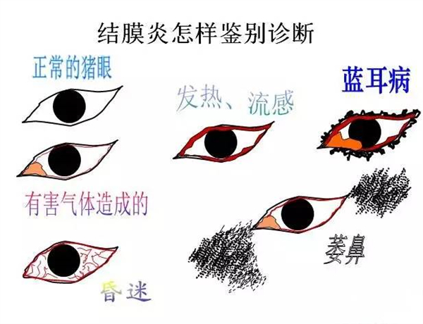 通过不同的眼睛情况也可以对母猪的发病进行初步的判断。如蓝耳病、波氏杆菌引起的萎缩性鼻炎、猪流感、环境等造成的眼睛结膜炎和分泌物情况有所不同,可以借此作为一定的疾病诊断依据。