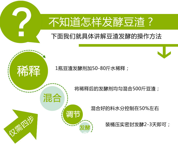 发酵方法:先将半瓶的农富康豆渣发酵剂和玉米面或麦麸搅拌均匀,再将剩下的发酵剂和水搅拌在一起拌均匀,把豆渣、加豆渣发酵剂的水、和加豆渣发酵剂的玉米面或麦麸三者一起搅拌均匀(之所以将豆渣发酵剂分成一半一半的混合,就是为了将豆渣发酵剂和其他东西拌均匀),找一个洁净的密封的塑料桶或其他能够密封的容器,密封发酵2-5天,发酵好的豆渣有浓浓的酸香味,即发酵完成。
