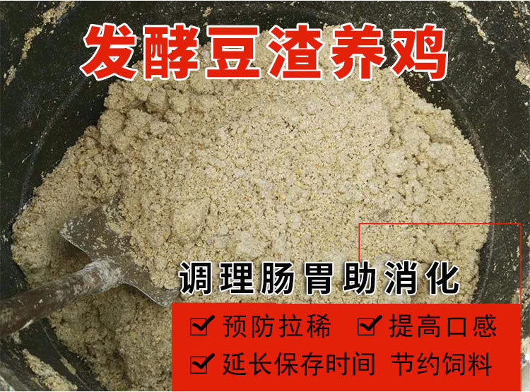 传统利用豆渣做养鸡饲料,大部分是直接饲喂生豆渣或者通过蒸煮加热处理,但是这些方法,容易造成鸡腹泻拉稀,影响生长,这是因为豆渣中含有抗胰蛋白酶、皂素、血凝素等抗营养因子,其中胰蛋白酶抑制因子,它能阻碍鸡体内胰蛋白酶对豆类蛋白质的消化吸收,造成腹泻,影响生长,适口性差,难于消化,饲料效价低。