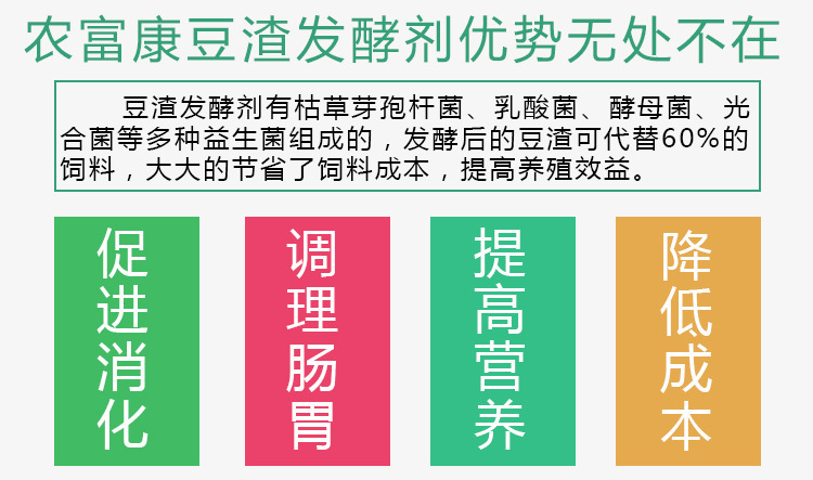 3、营养成分提高。农富康豆渣发酵剂由曲霉菌、酵母菌、芽孢杆菌等几十种有益微生物组成,所以豆渣中维生素、大量有益微生物和乳酸等酸化剂也会大幅度增加。