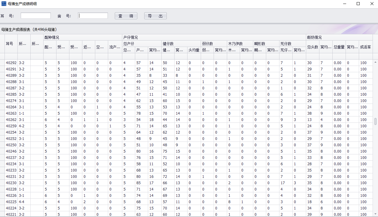 由上图可以看到,数据分析内容是母猪生产的各个阶段需要收集的最基本的28项生产数据分析。这些数据是什么来的呢,是从每天的数据录入得来的。以上数据分析反映了母猪的生产情况,同时数据信息也指导着后续生产工作的计划安排,这些都维系着电子游艺网站