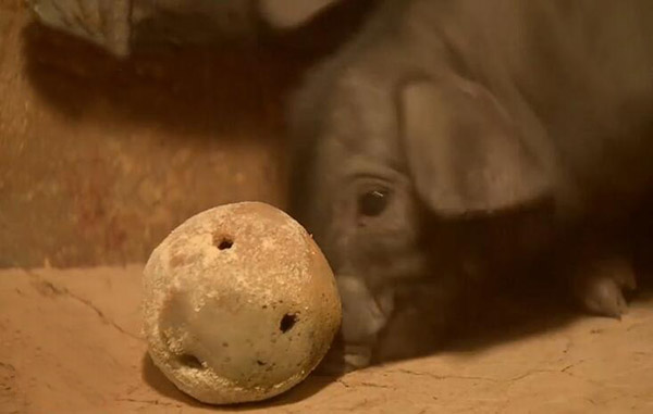 小猪生性好玩,听到哗哗响作响,就忍不住好奇起来。猪是哺乳类四肢着地,因此玩的时候大都用嘴,因为添加的有食盐,小猪就忍不住去舔食。就利用小猪贪玩的这个习性,将“玩具”放在食盆中滚上一圈(食料要做成糊状才好)沾满稀料。小猪在玩耍的过程中, 不知不觉的就将食料吃进肚子。自然就解决了小猪吃初食的问题。