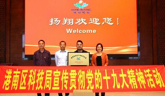 港南区科学技术局以举办“宣传贯彻党的十九大精神”活动为契机,局长周景勇、副局长陆庆娟一行,到广西扬翔股份有限公司,为公司授以港南区知识产权试点企业牌匾。