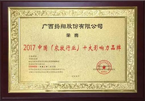 2017年9月14日,扬翔股份荣膺“2017中国(农牧行业)十大影响力品牌”、“2017中国创新力(农牧行业)十大领军品牌”。