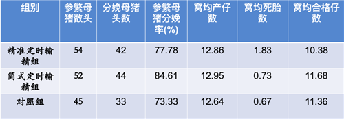 定时输精是通过注射外源激素,人为调控母猪性周期,使之在预定的时间内集中发情、排卵和配种的一项繁殖新技术,包括性周期同步化、卵泡发育同步化、排卵同步化和配种同步化,它们是互相依存、紧密联系的过程。定时输经技术对后备猪繁殖性能的有何影响?下面看一组实验数据,以精准定时输精组作为A组,简式定时输精组作为B组,C组为普通对照组。