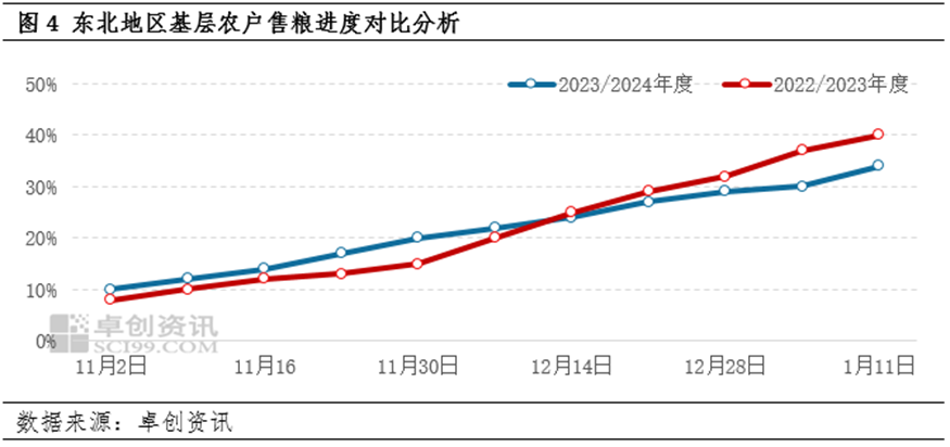 据卓创资讯数据统计,截止到上周四(1月11日),华北地区基层农户玉米售粮进度总体在30%,基层余粮仍有70%,同比去年慢11个百分点。