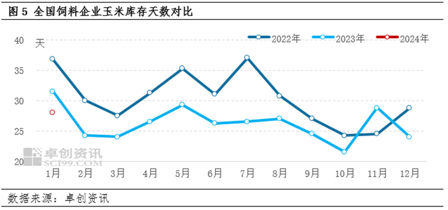 据卓创资讯调研了解,目前南方中大型饲料企业年前备货基本收尾,库存基本在一个月基础上滚动补库;部分小型饲料企业玉米库存基本维持在20天基础上滚动补库,因下游养殖需求疲软,饲料销售欠佳,玉米缺口相对较小,年前备货基本结束,年后货源少量采购。终端养殖需求对玉米采购及消费支撑力仍然不足,对玉米价格难有利多支撑。
