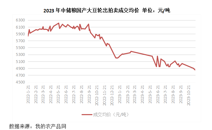 国产大豆拍卖量下降。据我的农产品网统计数据,2023年中储粮国产大豆轮出拍卖挂牌量147.4万吨,较上年减少69.1万吨,成交46.1万吨,成交率31.3%,较上年上升10个百分点。成交均价4704.6元/吨,较上年下降21.2%。国产大豆拍卖成交均价2023年整体呈下行趋势。