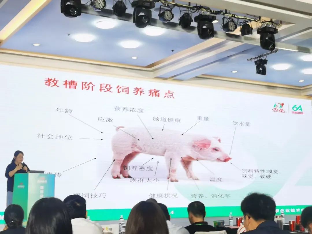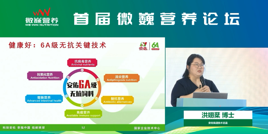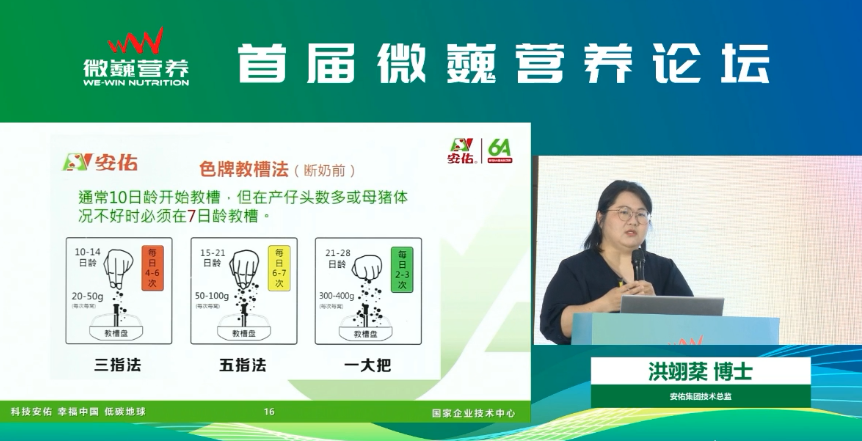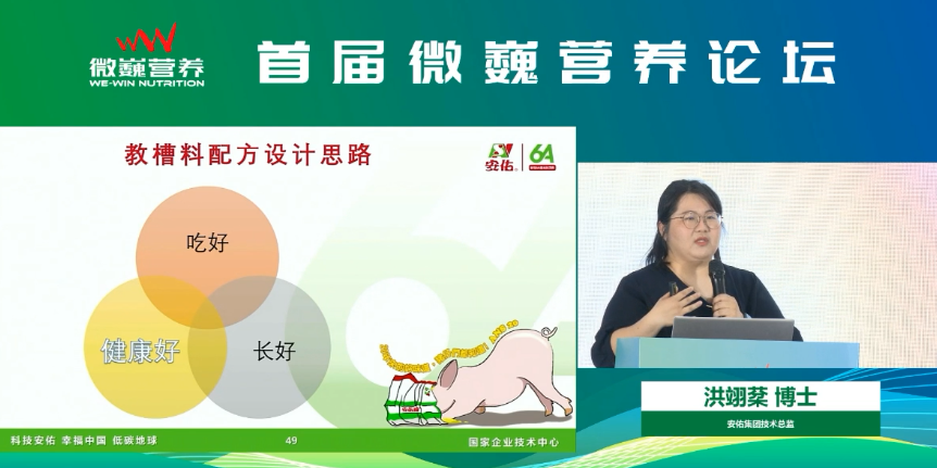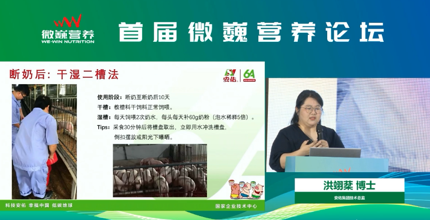 安佑集团受邀亮相本次行业盛会,安佑集团首席技术官洪翊棻博士受邀参加,在教保料专题中做《教保料痛点解析》主题报告,探讨教槽阶段饲养痛点,发挥乳猪潜力的饲养方法,并分享禁抗后乳仔猪料配方的设计思路。