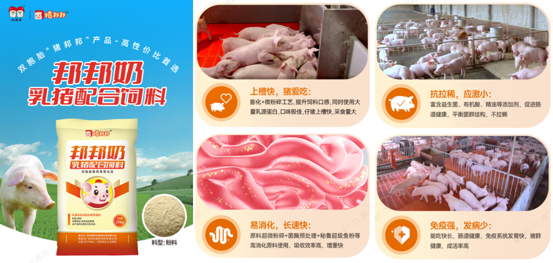 “猪邦邦”,是2023年双胞胎集团的全新品牌。在生产工艺上,复用双胞胎20年的猪饲料生产线,并采用全球精选的优质原材料,运用科学的配方、独特的生产工艺和严格的质量管理体系,确保生产出来的每一颗饲料都具有品质的保障。