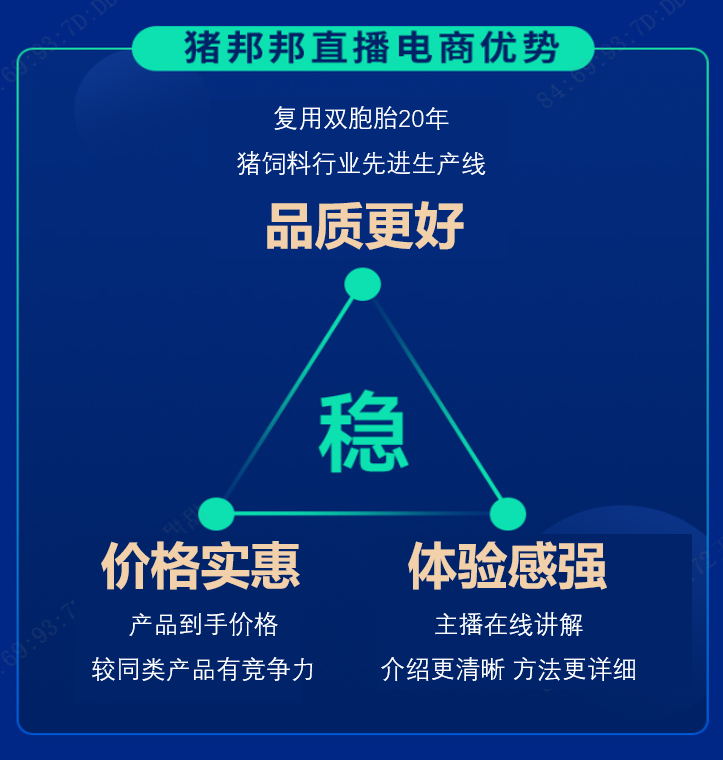 “猪邦邦”采用直播方式,养户可以直观的看到饲料的实物。通过主播讲解,产品介绍更清晰,用料方法更详细,体验感强!并且,产品主播均为行业从业人员或知名人士,对猪只的饲养、养猪行业分析均有认识,能更好的帮助养户提供饲料选择,用料方法等相关服务!