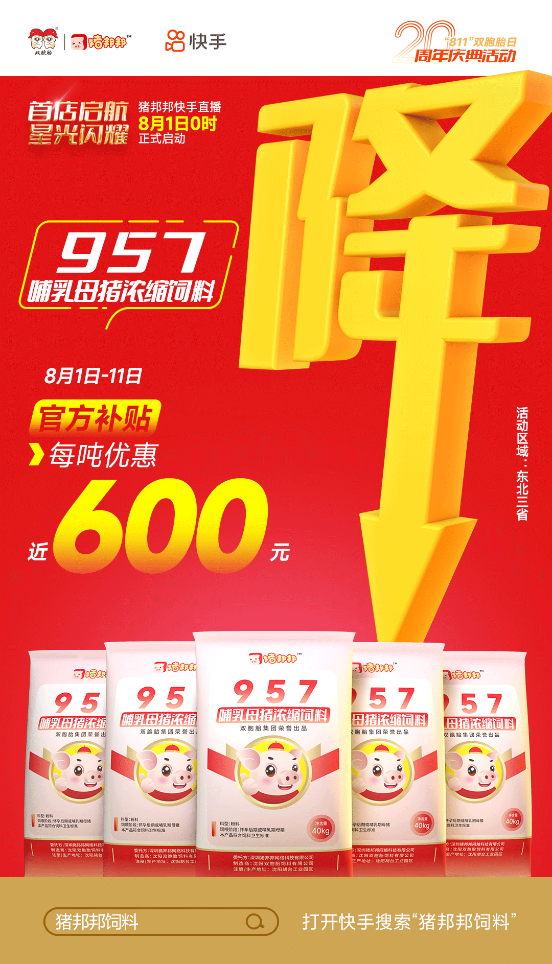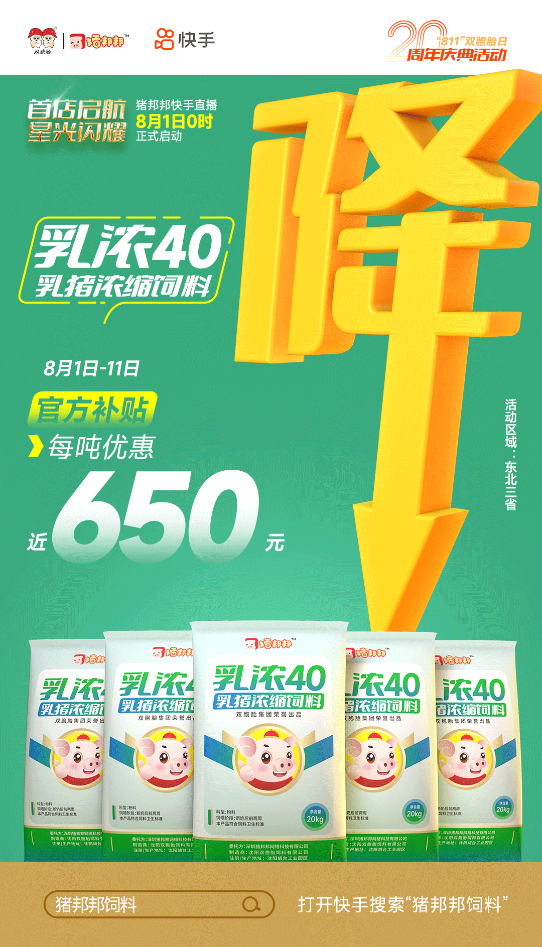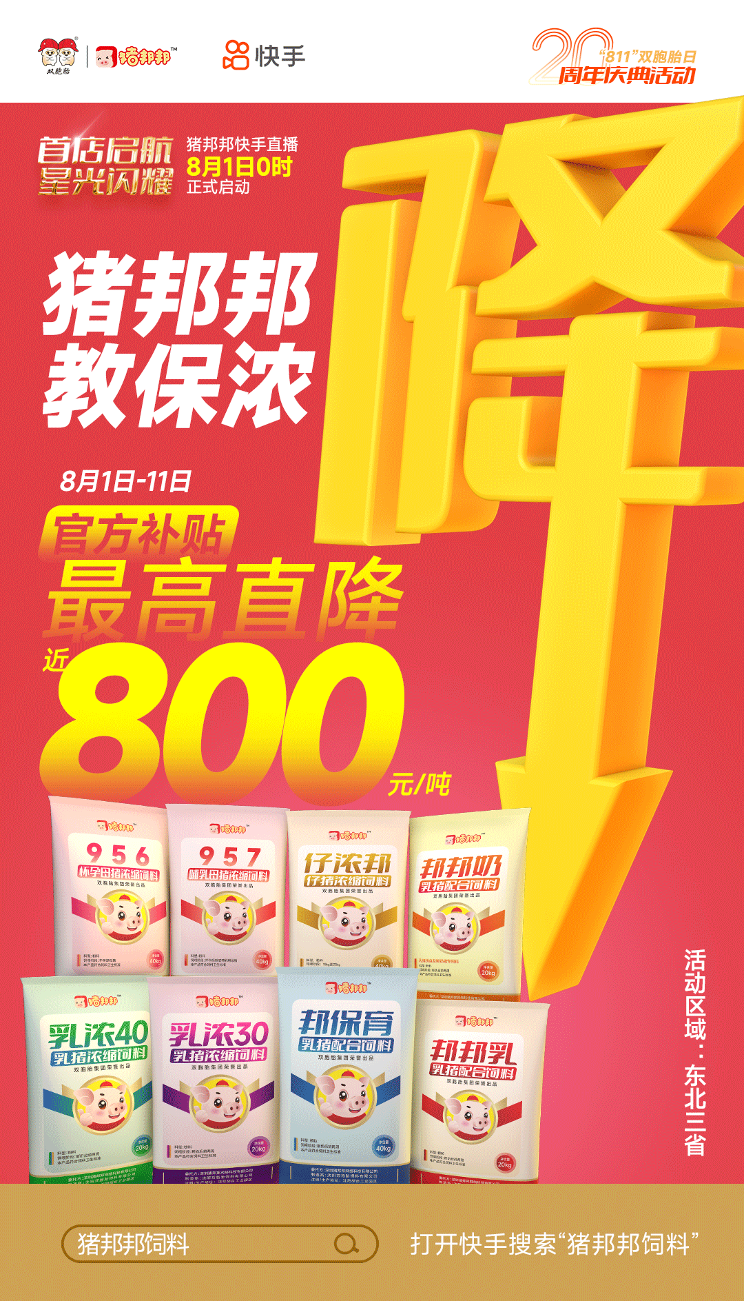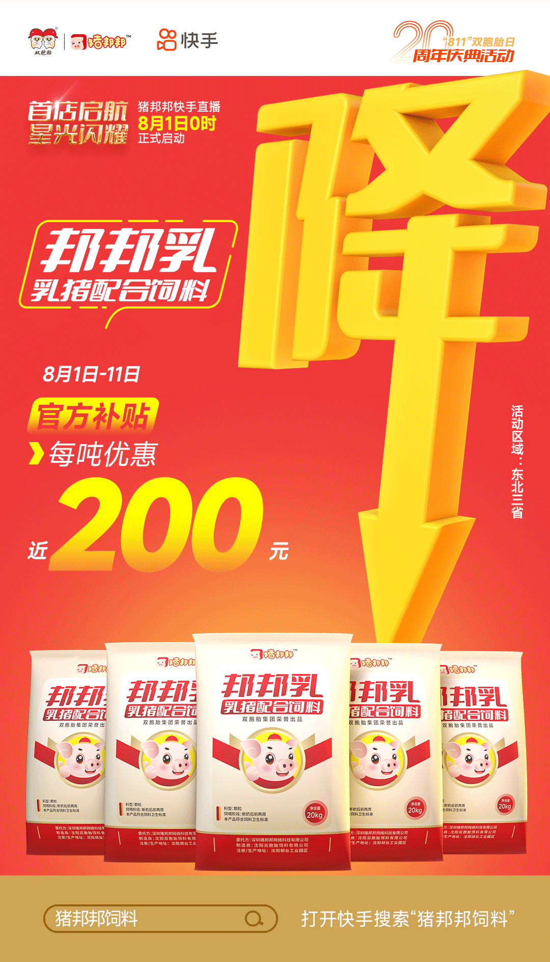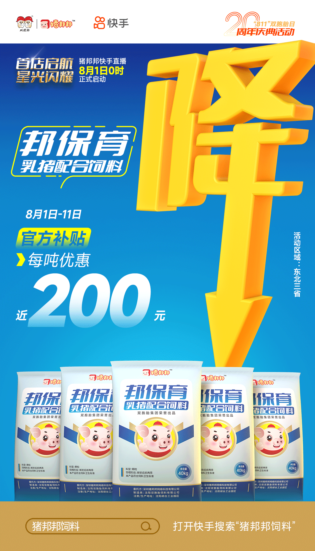双胞胎为了回馈广大客户,助力养猪朋友们度过猪业“寒冬”,8月1日“猪邦邦”在快手平台闪亮登场,平台补贴,超级大促,打造最真诚、最实在的优惠活动(活动区域:东北三省)!