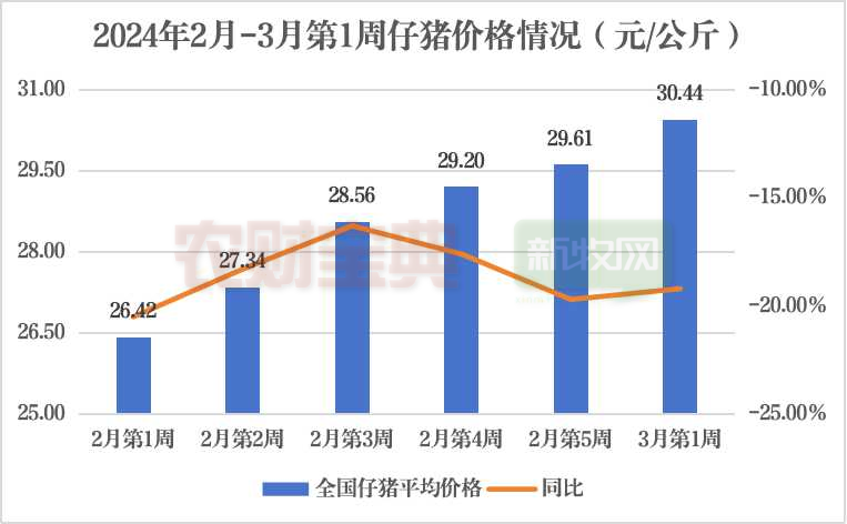 3月第1周全国仔猪平均价格30.44元/公斤。2月-3月第1周全国仔猪均价持续上升,3月第1周比2月第1周高4.02元/公斤。期间每周全国仔猪均价同比均低于去年水平,最大跌幅20.50%。