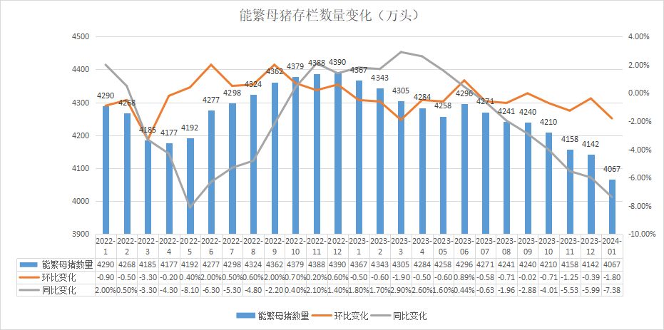 除了猪市行情牵动养户们的神经,产能去化速度同样如此。1月末,我国能繁母猪保有量已降至4067万头,能繁母猪锐减75万头,环比下降1.8%,同比大降7.38%,产能去化提速较为明显。