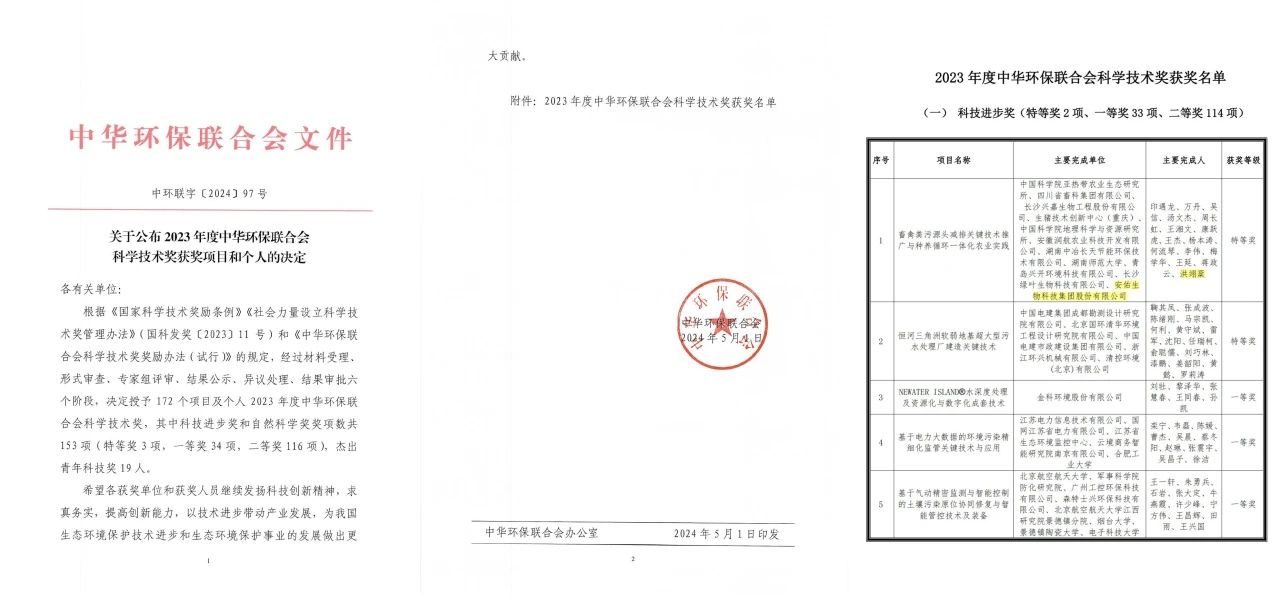 近日,备受瞩目的2023年度中华环保联合会科学技术奖正式揭晓,安佑集团作为合作单位参与完成的项目——《畜禽粪污源头减排关键技术推广与种养循环一体化农业实践》荣获:科技进步特等奖