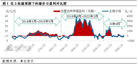 自2022年4月开始,猪价开始出现震荡上涨态势,到2022年10月份时出现本轮猪周期的最高点,猪价达到28.62元/公斤,累计上涨16.36元/公斤,涨幅133.44%。此后进入下滑阶段,并于2023年1月份结束本轮持续下降的过程,彼时最低点为13.78元/公斤,累计下降14.84元/公斤,降幅51.85%。自2023年2月份至今,价格进入频繁震荡阶段,该阶段目前的最低点为2024年1月份的13.24元/公斤,卓创资讯预计3月份或出现该阶段的最低点。从盈利情况来看,本轮猪周期月度养殖盈利亏损的时长达到13个月,截至目前占比56.52%,与前两轮猪周期的亏损时长占比相比分别高出46.11个百分点及33.12个百分点。