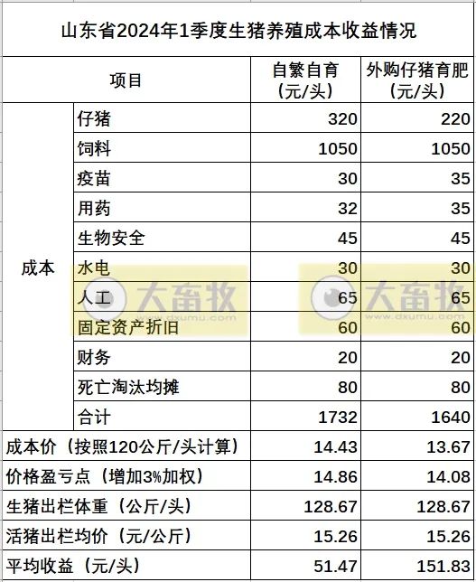 外购仔猪育肥头均盈利152元,远高于自繁自育!山东省2024年1季度生猪养殖成本收益情况公布