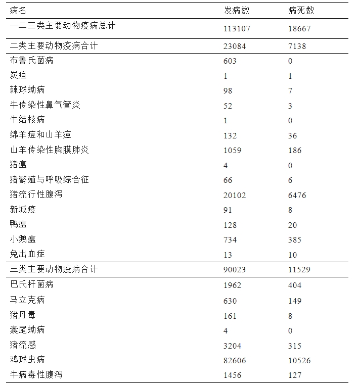 备注:本表统计数据来自各省、自治区、直辖市和新疆生产建设兵团报告发生的一二三类主要动物疫病信息。