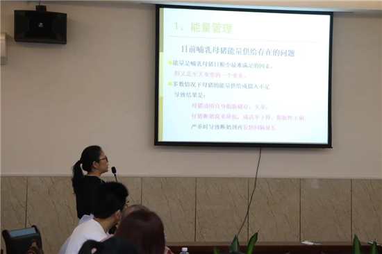 的生产成绩和经营绩效起关键作用。福建农职院的黄晶老师带来了《夏季哺乳母猪的营养调控》的课题训,黄老师详细讲解了泌乳期母猪的营养管理以及如何提高泌乳期母猪的采食量。