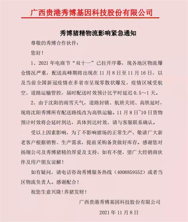 受特殊极端天气,以及“双十一”消费旺季、部分新冠疫情地区交通管制等因素的影响,届时沈阳秀博物流配送时效预计比平时延迟0.5-1天。