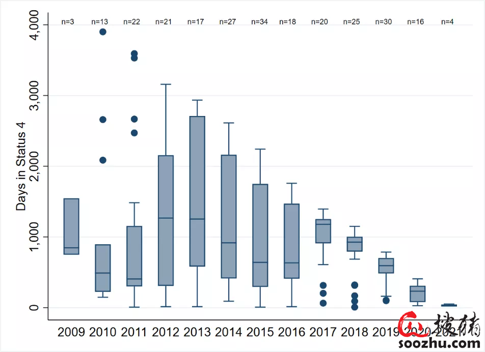 图:按进入状态4的年份统计的状态4保持时间。例如2009年有3个电子游艺网站