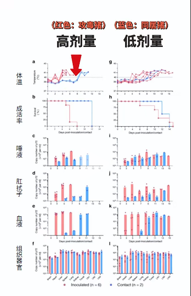 在同居猪出现临床症状时,它的唾液中是排毒的。在肛拭子里面它的排毒不是那么强。同居猪从第四天开始,到出现明显的临床症状,唾液和肛拭子都已经排毒了,第五天出现临床症状以后,第九天开始血液中的病毒含量是非常高的。所以无论你是哪一毒株,它是唾液排毒多还是粪便排毒多,血液是必采的。
