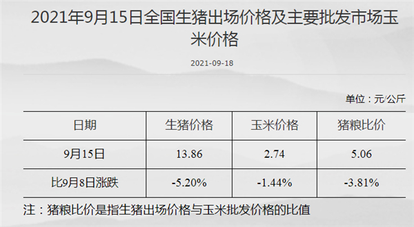 2021年09月15日猪粮比:生猪价格及玉米批发价格