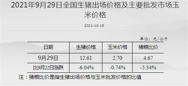 2021年09月29日猪粮比:生猪价格及玉米批发价格