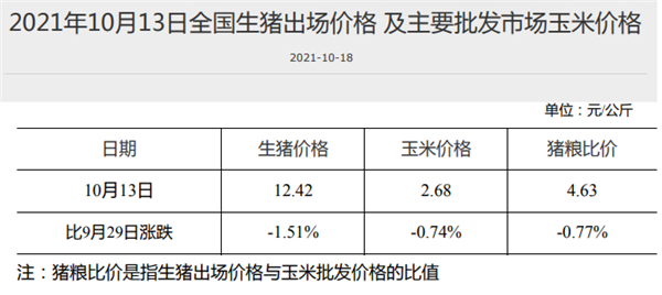 2021年10月13日猪粮比:生猪价格及玉米批发价格