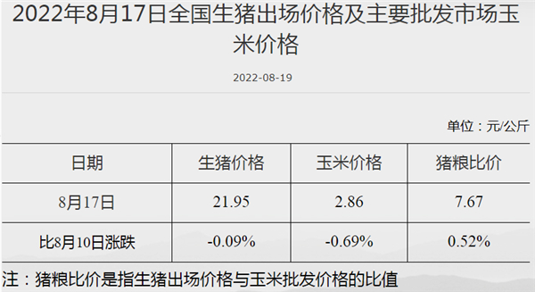 2022年08月17日猪粮比:生猪价格及玉米批发价格