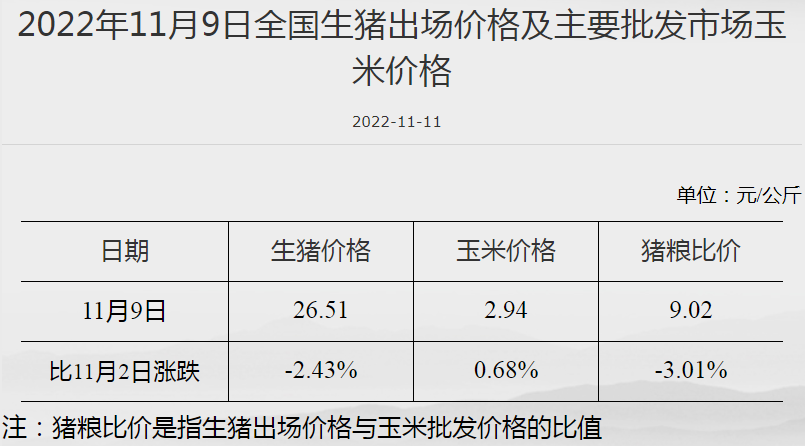 2022年11月09日猪粮比:生猪价格及玉米批发价格