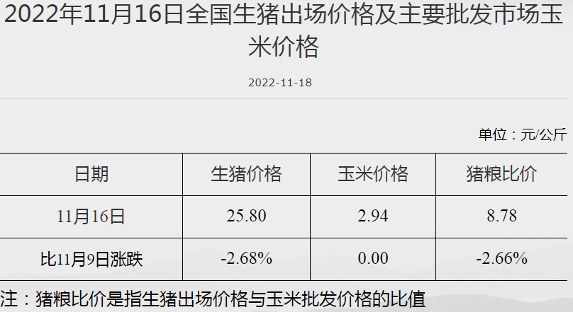 2022年11月16日猪粮比:生猪价格及玉米批发价格