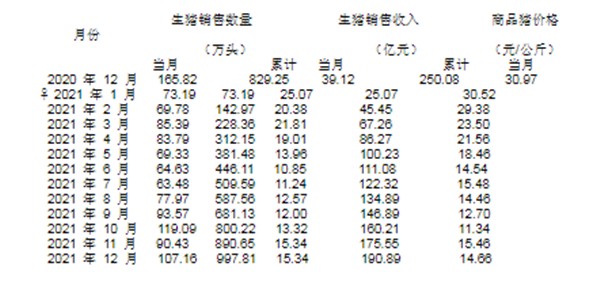 新希望六和股份有限公司2021年12月生猪销售情况简报