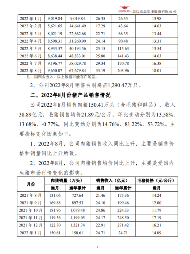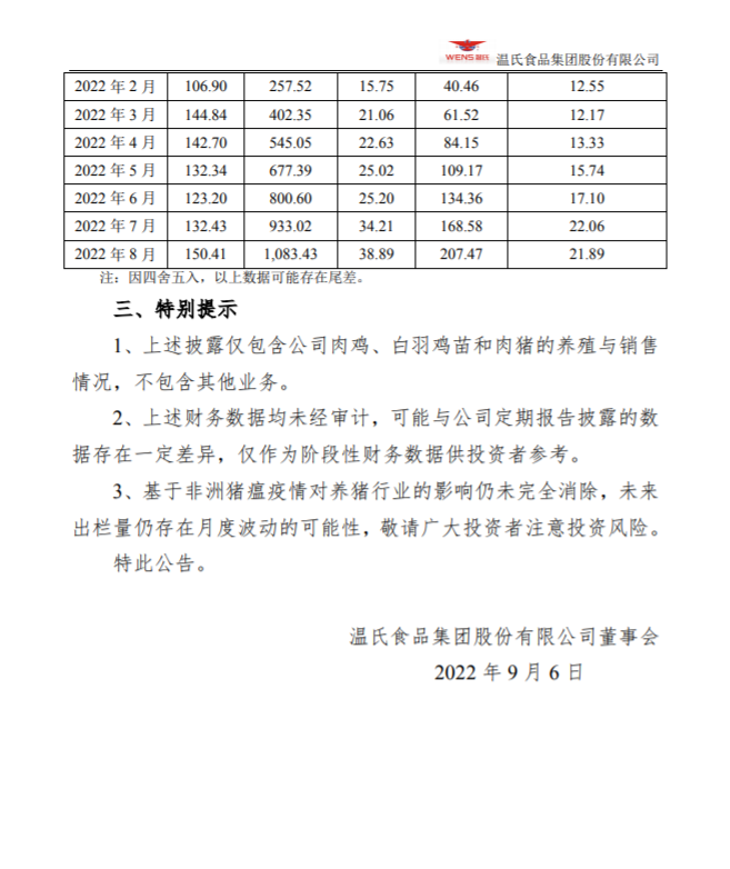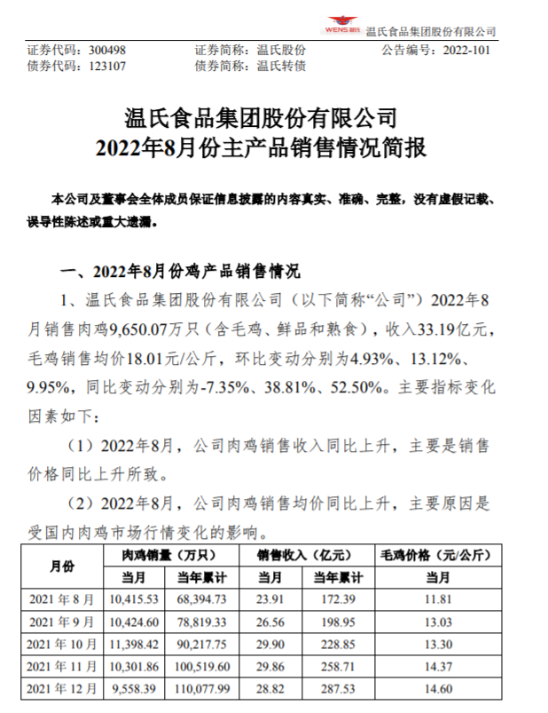温氏股份:2022年8月份主产品销售情况简报