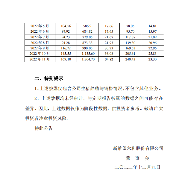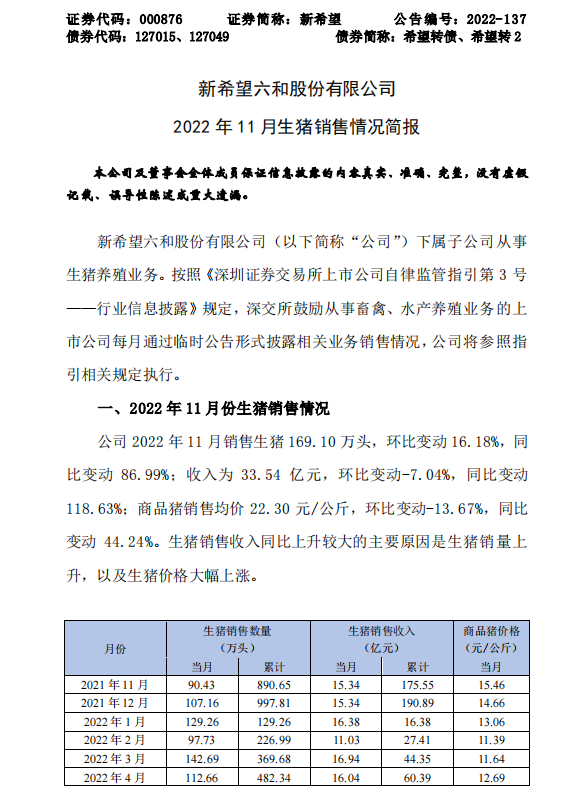 新希望六和股份有限公司2022年11月生猪销售情况简报