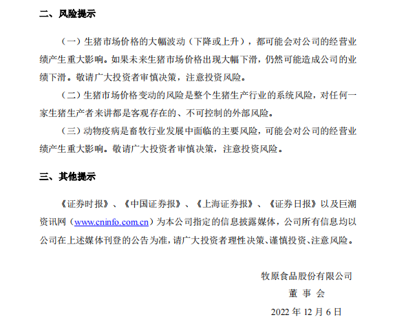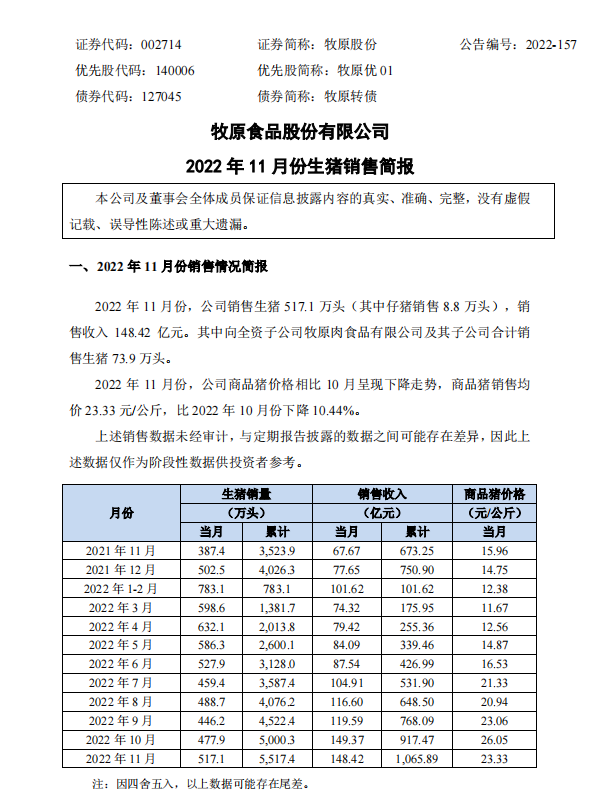 牧原食品股份有限公司2022年11月份生猪销售简报