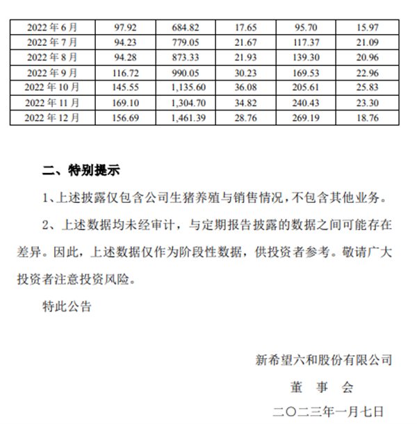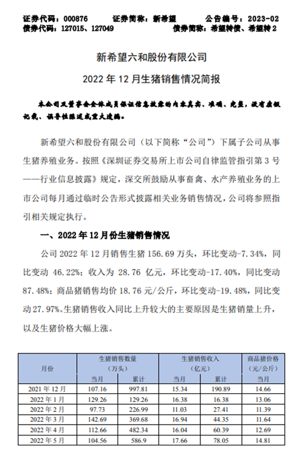 新希望六和股份有限公司2022年12月生猪销售情况简报