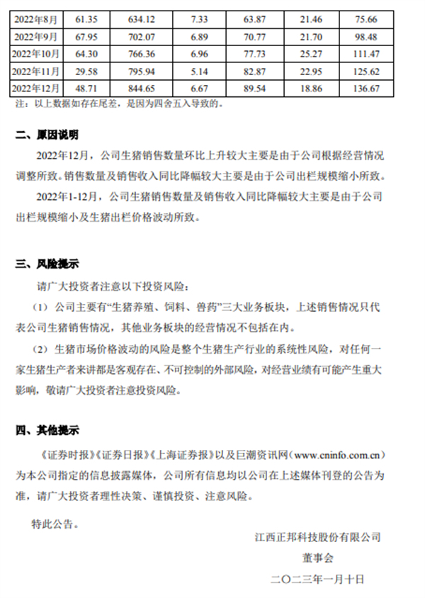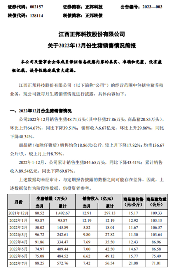 江西正邦股份有限公司2022年12月份生猪销售简报
