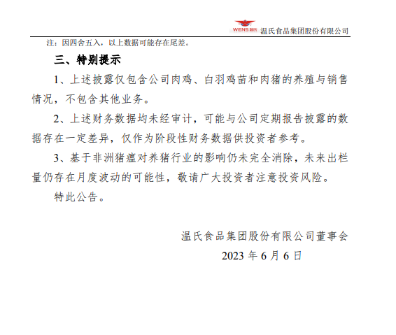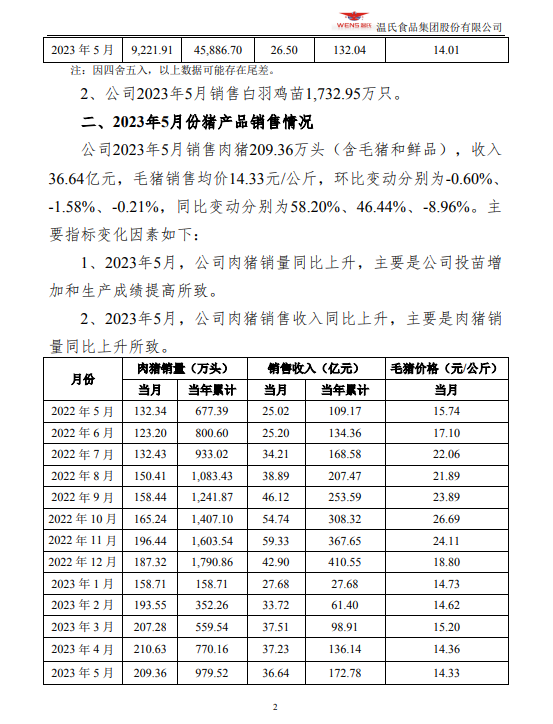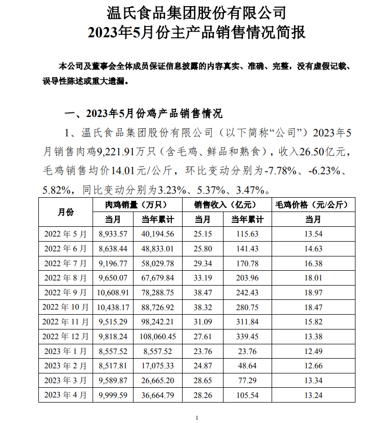 温氏食品集团股份有限公司2023年5月份主产品销售情况简报