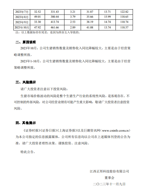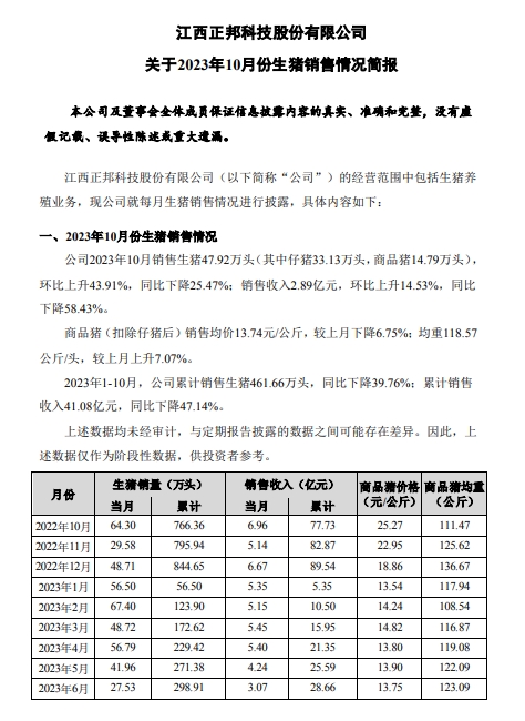 江西正邦科技股份有限公司2023年10月份生猪销售情况简报