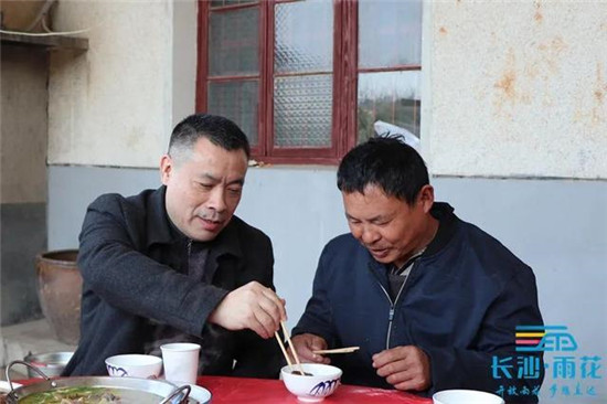 搭配农家土菜,既有美味,更有浓浓的情味、年味,冯聪龙拉着张岳辉坐在自己身边,与他拉家常,问他最近的情况,临走时他鼓励张岳辉:“我们都是一家人,大家一起努力就没有什么困难,过年前我再来看你。”