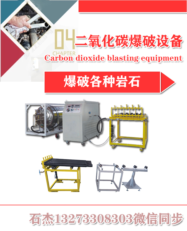 本实用新型的二氧化碳爆破设备,包括筒状的膨胀室,膨胀室的顶设置有吊环5和点火柱1,膨胀室的底配置有排气室9,膨胀室与排气室9之间配置有安全片4,排气室9的侧壁上开有排气孔7;排气孔7的数量为3个;排气孔7的直径为排气室9直径的1/7;排气室9的底配置有止飞头8。的止飞头8的直径与排气室9直径比为3:1。