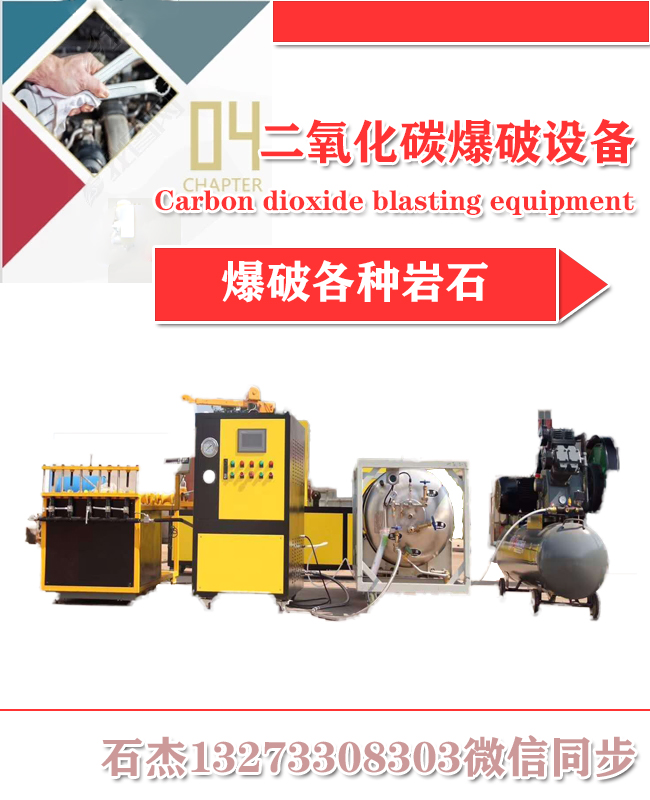 本实用新型的二氧化碳爆破设备,包括筒状的膨胀室,膨胀室的顶设置有吊环5和点火柱1,膨胀室的底配置有排气室9,膨胀室与排气室9之间配置有安全片4,排气室9的侧壁上开有排气孔7;排气孔7的数量为2个;排气孔7的直径为排气室9直径的1/6;排气室9的底配置有止飞头8。止飞头8与排气室9密封连接。的止飞头8的直径与排气室9直径比为2:1。