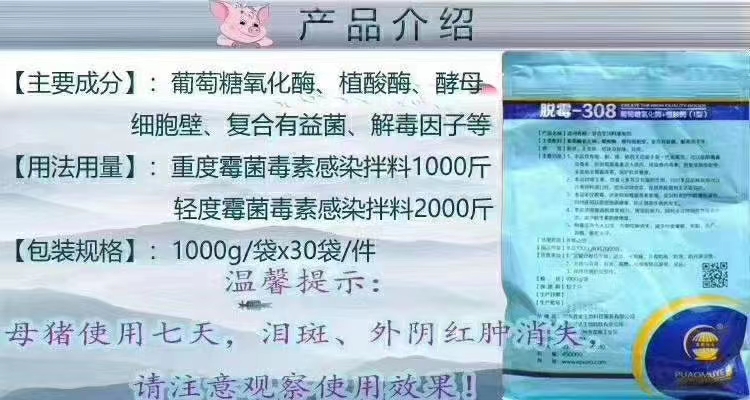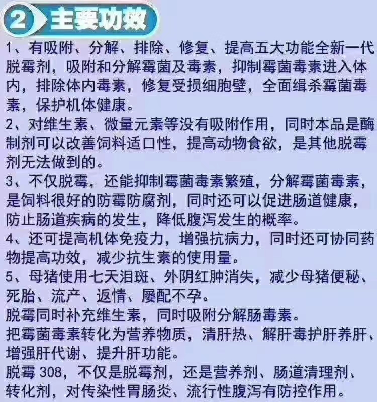 普奥脱霉-308养殖户可以信赖的纯生物脱霉剂,普通脱霉剂治具有吸附霉菌毒素的作用,生物型脱霉剂具有在肠道内溶解霉菌毒素,同时具有调理肠道,补充维生素氨基酸的作用。使用脱霉308 15天以后母猪,母牛。母羊,身上老皮。死茧,都开始慢慢脱落,身上越来越干净,脱霉保肝护肾功能特别好。