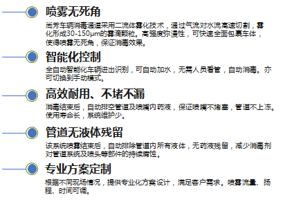 技术在最短的时间快速将消毒剂弥漫整个车辆,彻底解决车辆消毒不彻底、有死角的现状,同时解决车辆喷雾消毒过程中普遍存在的堵塞、滴漏、易腐蚀、不防冻等方面的问题。