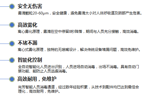 尚芳智能人员消毒通道为解决养殖场人员消毒形式化、错误化和消毒设备对人体本身有害等问题,推出了全方位安全健康消毒的离心雾化设备。